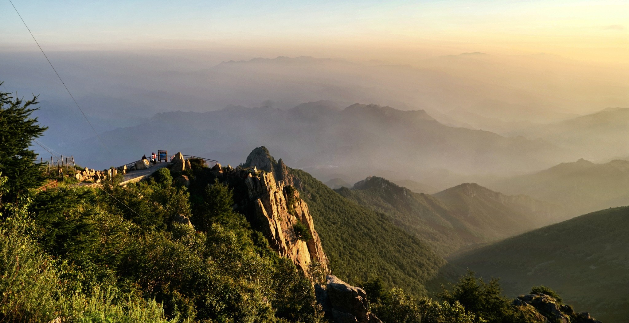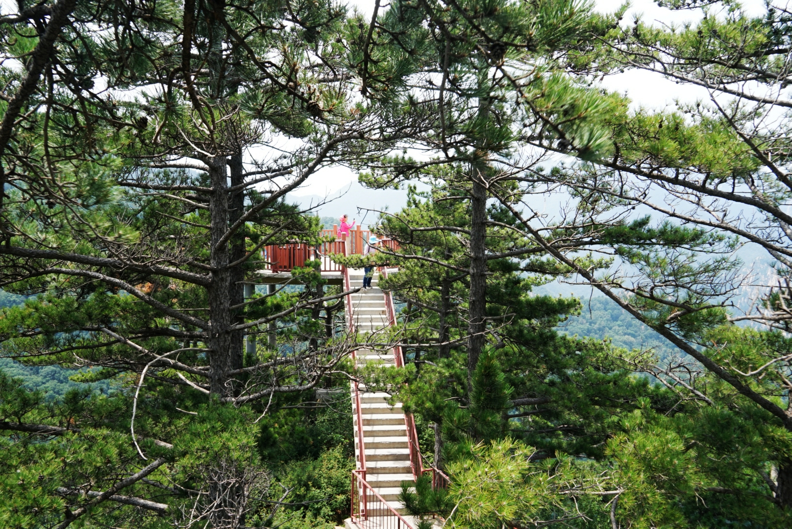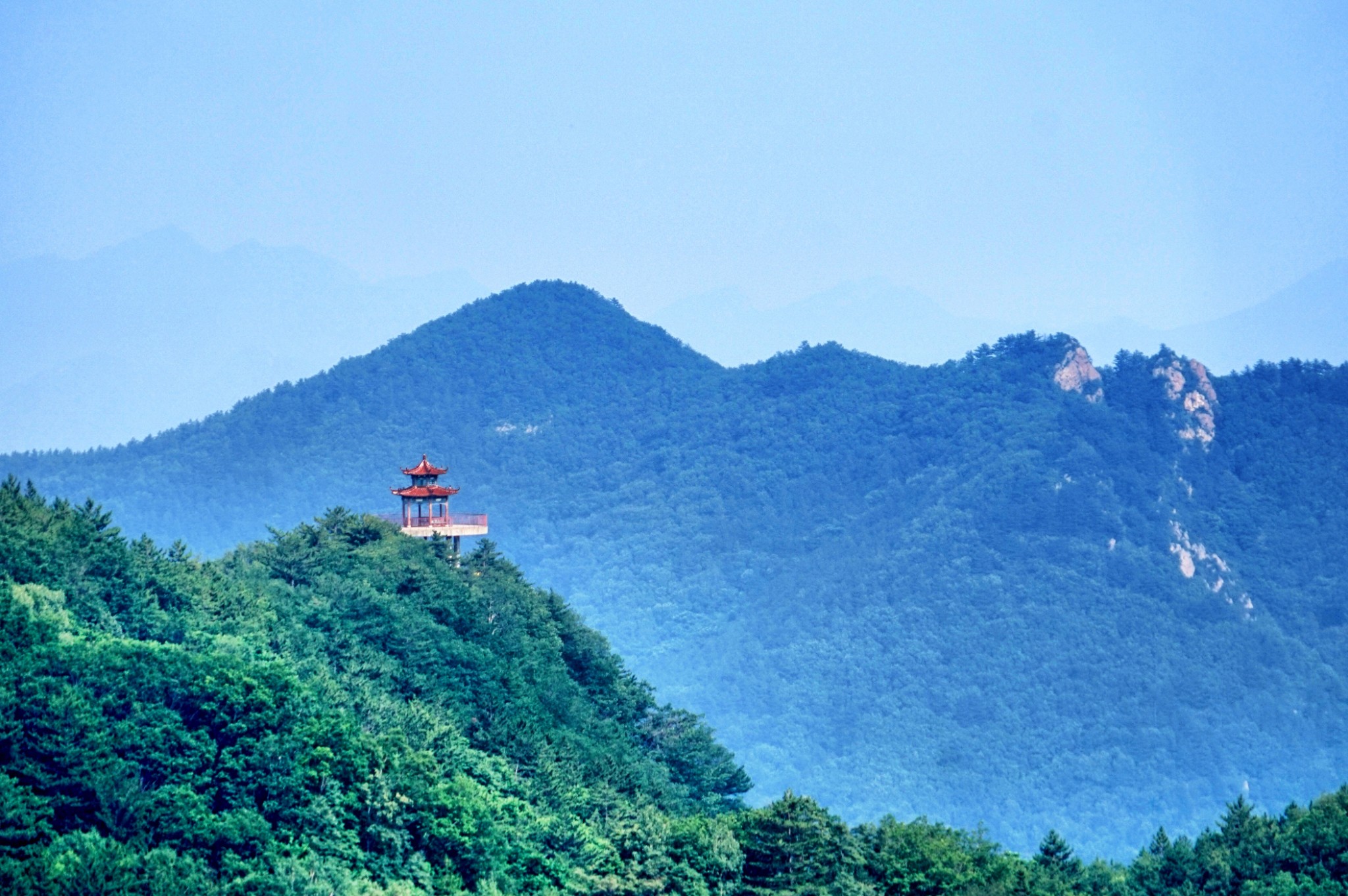雾灵山森林公园在林海云天观景亭俯瞰群山。