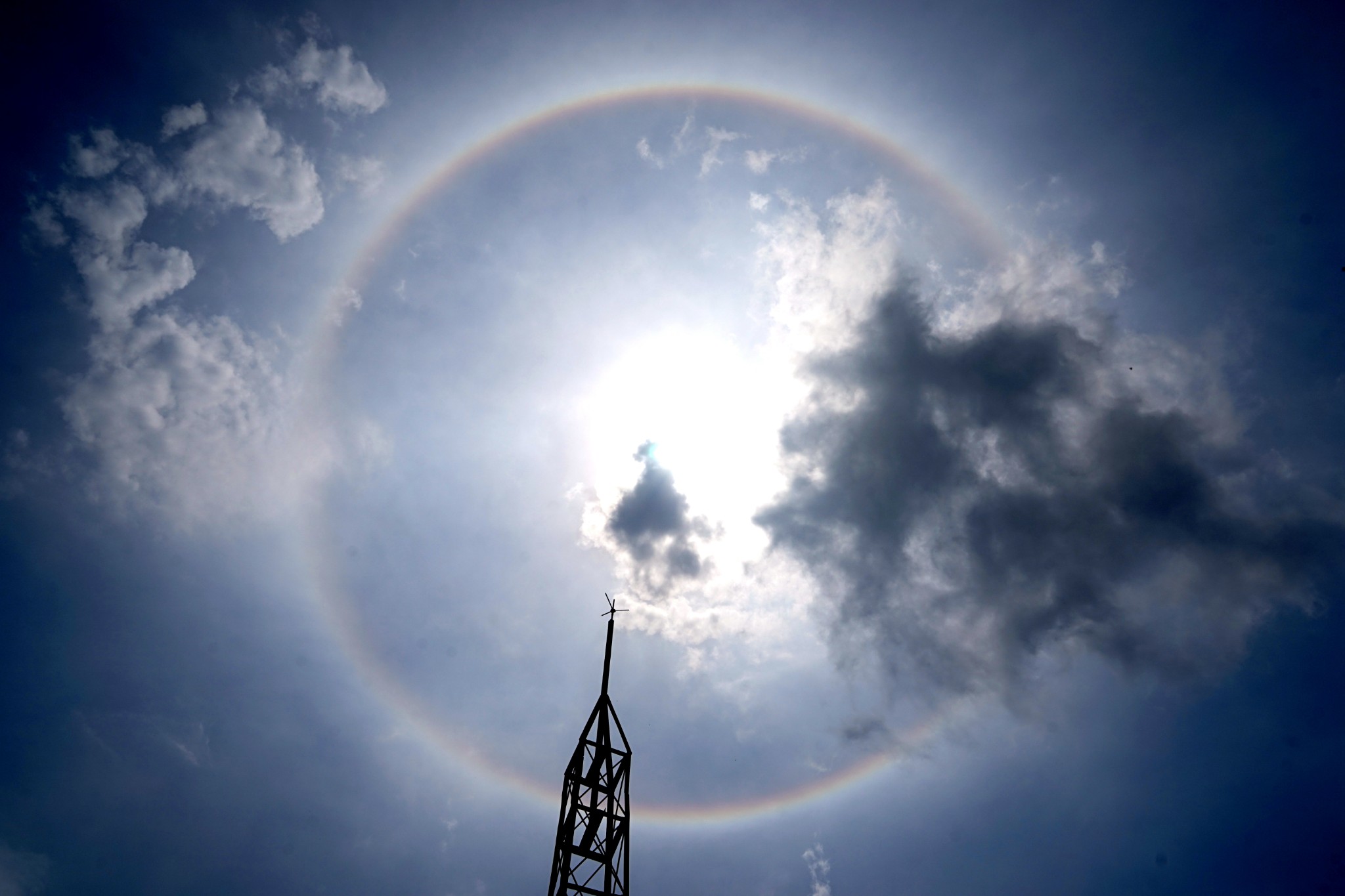 日晕,又叫圆虹,一种大气光学现象,是 日光 通过卷层云时,受到冰晶的折射或反射而形成的。当光线射入卷层云中的冰晶后,经过两次折射,分散成不同方向的各色光。