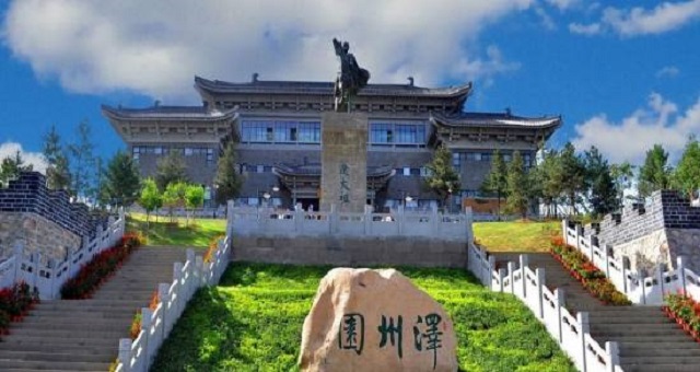 泽州园景区最有名的建筑是就日馆。是一座契丹文化博物馆、中华菌文化博览中心的综合展馆。