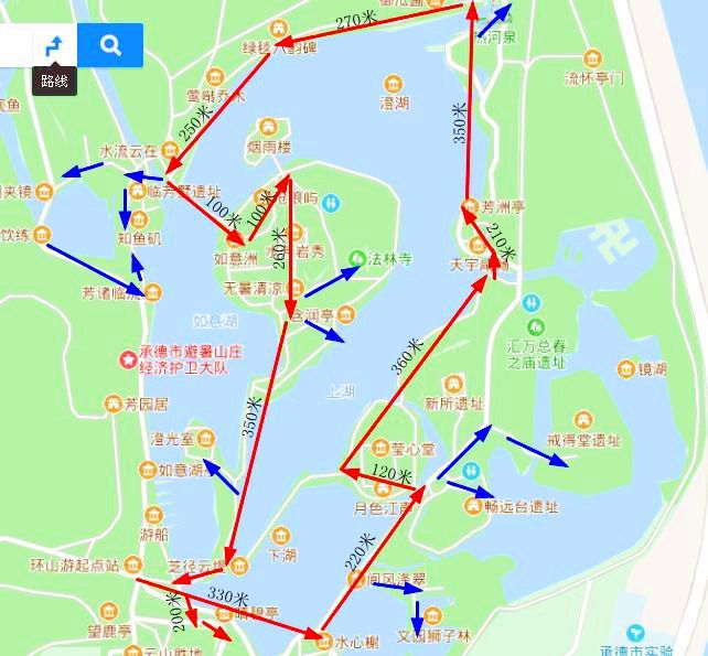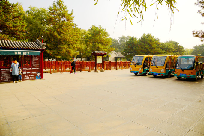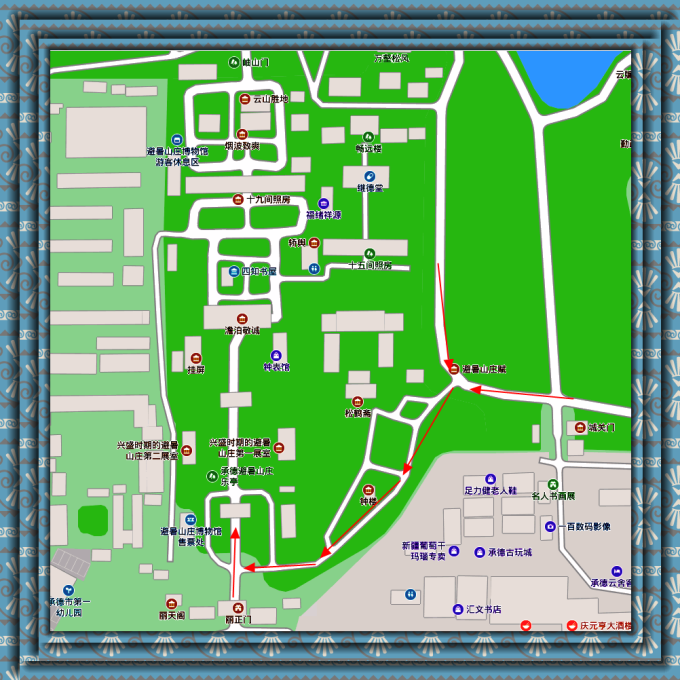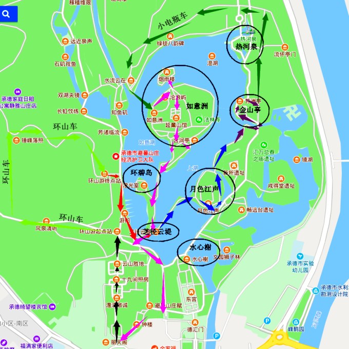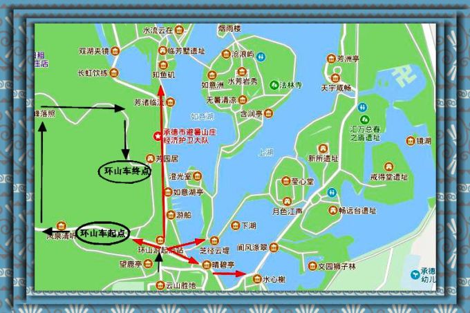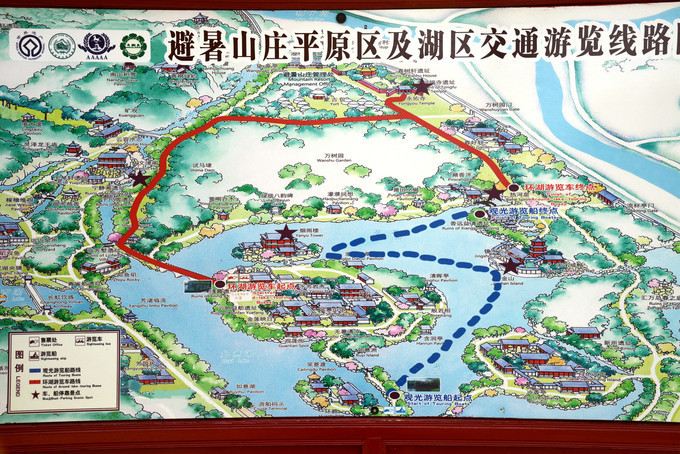去平原区是电瓶车(红线),起点在如意洲(烟雨楼),停靠站点水流云在、文经阁、万树园、 蒙古 包、永佑寺、苹香沜、终点热河。
