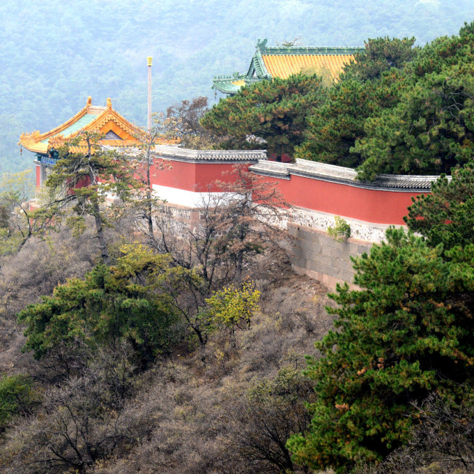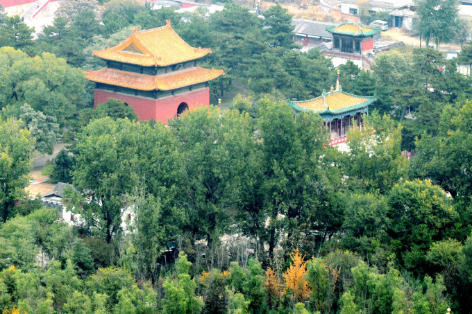 向南眺望,绿树掩映之中有一座红墙琉璃瓦的大型建筑,在苍松翠柏中显得非常醒目,那就是避暑山庄内的道教寺庙—— 广元 宫。 广元 宫的建筑布局、形制与 泰山 碧霞元君祠几无二制,只是规模稍小一些,这与避暑山庄的造园思想相契合,追求与环境相适应。即便如此,在屋顶的装饰上追求的却是皇家气度,全部为琉璃覆顶, 广元 宫的红墙和耀人眼目的琉璃为山区增色不少,成为游人向往的胜境。