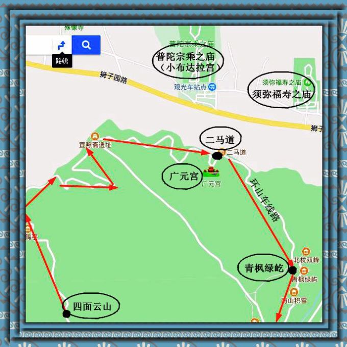 环山车只停留3站❶四面云山❷二马道❸青枫绿屿。车外景色就是苍松翠柏,没什么看头。理论上每站停留十分钟,不过到二马道站后可以无视。在二马道可以俯瞰外八庙之中的普陀宗乘之庙(小布达拉宫)、须弥福寿之庙。及 广元 宫。在青枫绿屿可以俯瞰永佑寺、棒槌山、蛤蟆石。