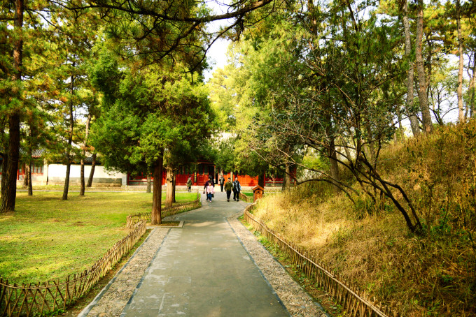 广场南边有一道红色照壁,使这座皇家园林与外界隔开。关于红照壁,传说里边藏有从鸡冠山飞来的金鸡,在夜深人静时,轻叩照壁,金鸡就会发出叽叽的叫声。若是想考证一下的话,就夜里到这里来听一听。