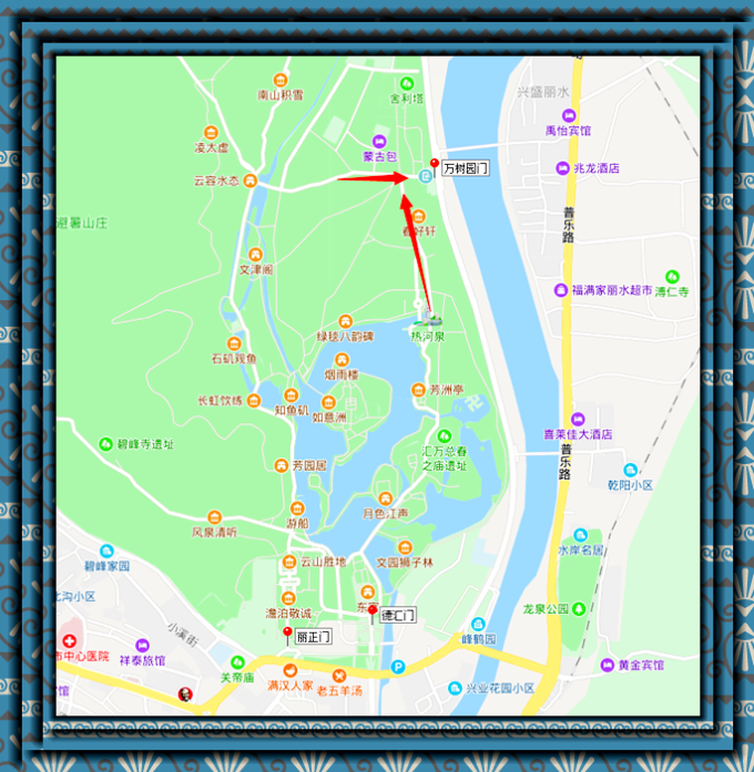对游客开放的景区大门有3个,丽正门、德汇门、万树园门( 东北 二门)。玩累了可以在万树园门出去。打车去其它地方。